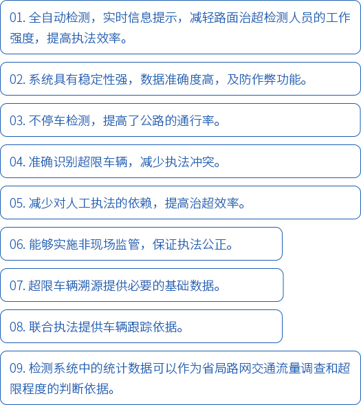 不停車超限超載檢測系統(tǒng)主要用于非現(xiàn)場執(zhí)法的治超系統(tǒng)將不停車動態(tài)稱重、視頻監(jiān)控、圖像抓拍及車牌識別、信息提示系統(tǒng)等有機(jī)集成,建立起一個(gè)全天候貨運(yùn)車輛超載違法行為監(jiān)控系統(tǒng),對貨運(yùn)車輛超載行為實(shí)施有效檢測和監(jiān)控,為交通管理部門提供治超執(zhí)法依據(jù)。在車輛行駛狀態(tài)中的超限超載檢測,有利于提高交通效率。系統(tǒng)的檢測數(shù)據(jù)資源可為公路行業(yè)交通量調(diào)查、路網(wǎng)監(jiān)測等管理工作提供共享信息。